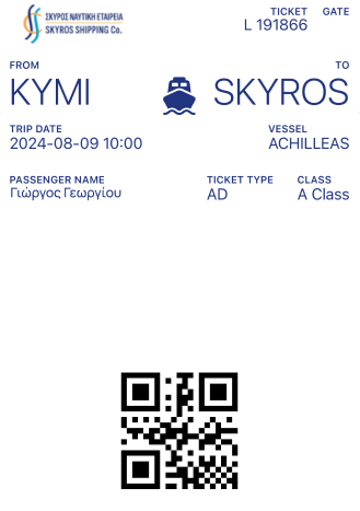Η Σκύρος Ναυτική Εταιρεία χρησιμοποίησε το Wallypass για ψηφιακά εισιτήρια επιβίβασης στο Apple & Google Wallet.